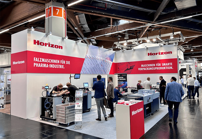 Občinstvo Fachpacka je pokazalo veliko zanimanje za predstavljen proizvodni proces, od izsekovanja in lepljenja embalaže s Horizon RD-N4055DM in Pro Cut Fold Stream do zgibanja letaka s Horizon AF-408F. (Vir: Horizon)